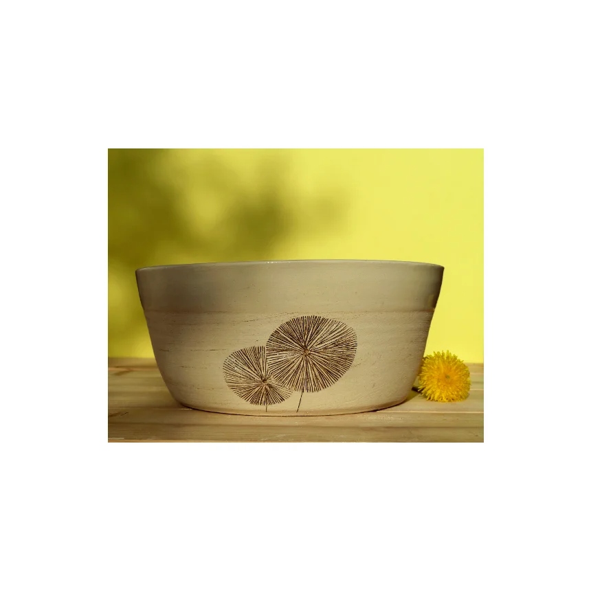 Die Außenseite wird mittels einer besonderen Technik mit Löwenzahn-Dekor künstlerisch verziert, wodurch die Schüssel zum eleganten Hingucker wird.
